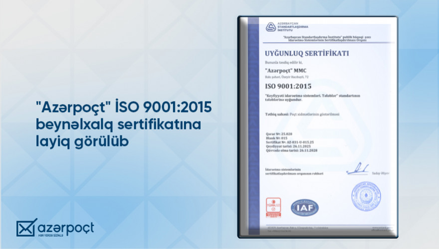 Bu sertifikat “Azərpoçt”un mükəmməlliyə doğru atdığı ardıcıl və inamlı addımının, həmçinin beynəlxalq keyfiyyət idarəetmə tələblərinə tam uyğunluğunun və müştəri məmnuniyyətinə verilən yüksək önəmin növbəti təsdiqidir.