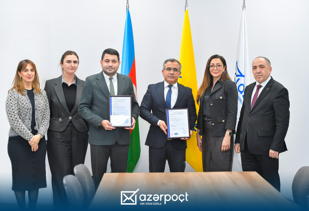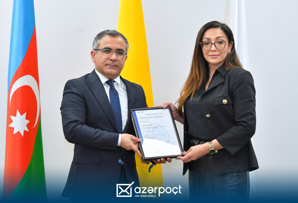 “ISO 9001:2015” beynəlxalq sertifikatı rəsmi qaydada AZSTAND tərəfindən “Azərpoçt” MMC-yə təqdim olunub. Sözügedən sertifikatın tətbiq sahəsi poçt xidmətlərinin göstərilməsini əhatə edir.