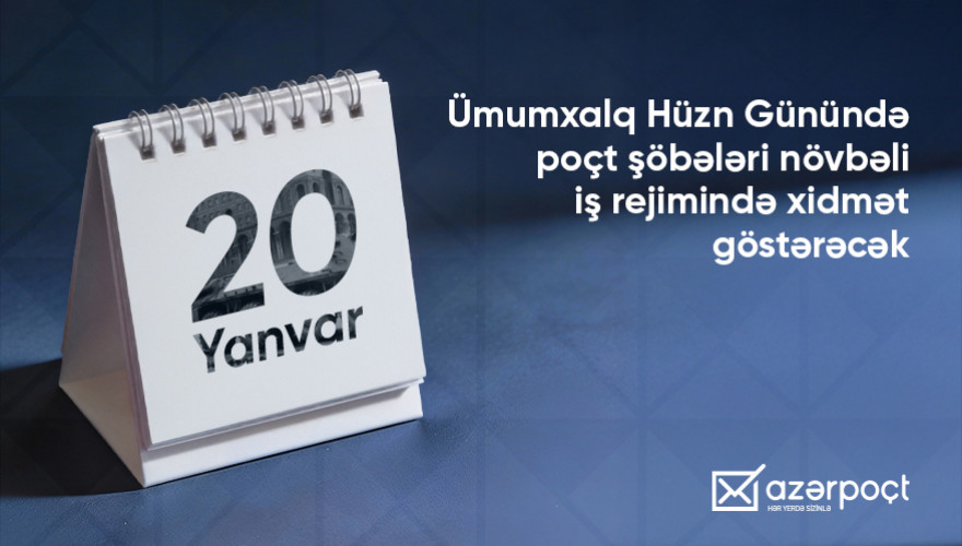 “Azərpoçt” MMC yanvarın 20-də Ümumxalq Hüzn Günü ilə əlaqədar olaraq poçt şöbələrində növbəli iş rejimi tətbiq edəcək.