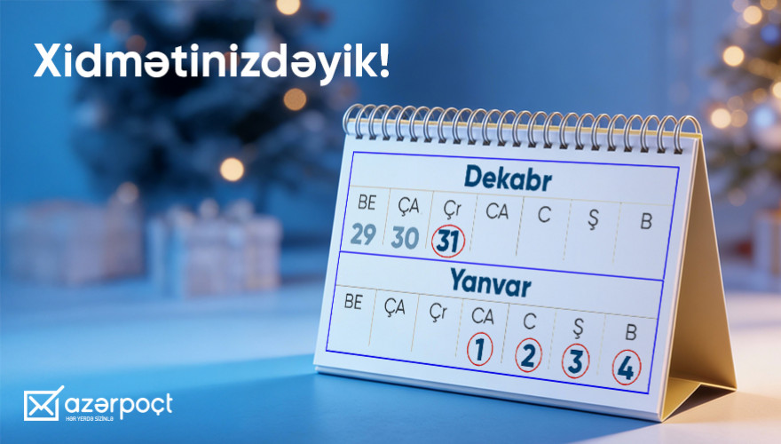 Dünya Azərbaycanlılarının Həmrəyliyi Günü və Yeni il bayramı günləri ilə əlaqədar qeyri-iş günü elan edilən 31 dekabr, 1, 2, 3, 4 yanvar tarixlərində “Azərpoçt” MMC əhalinin poçt, maliyyə, karqo və digər xidmətlərdən rahat və səmərəli istifadə etməsini təmin etmək məqsədilə xüsusi rejimdə fəaliyyət göstərəcək.