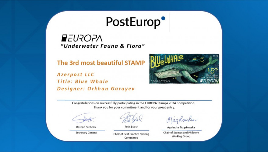 The Blue Whale stamp presented by Azerpost LLC, representing our country, took 3rd place in the Europe 2024 postage stamp competition.