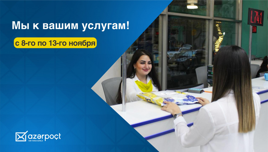 В связи с праздничными днями 8, 9, 10, 11, 12 и 13 ноября ООО "Азерпочта" будет работать в особом режиме с целью обеспечения удобного и эффективного использования населением почтовых, финансовых и других карго-услуг.